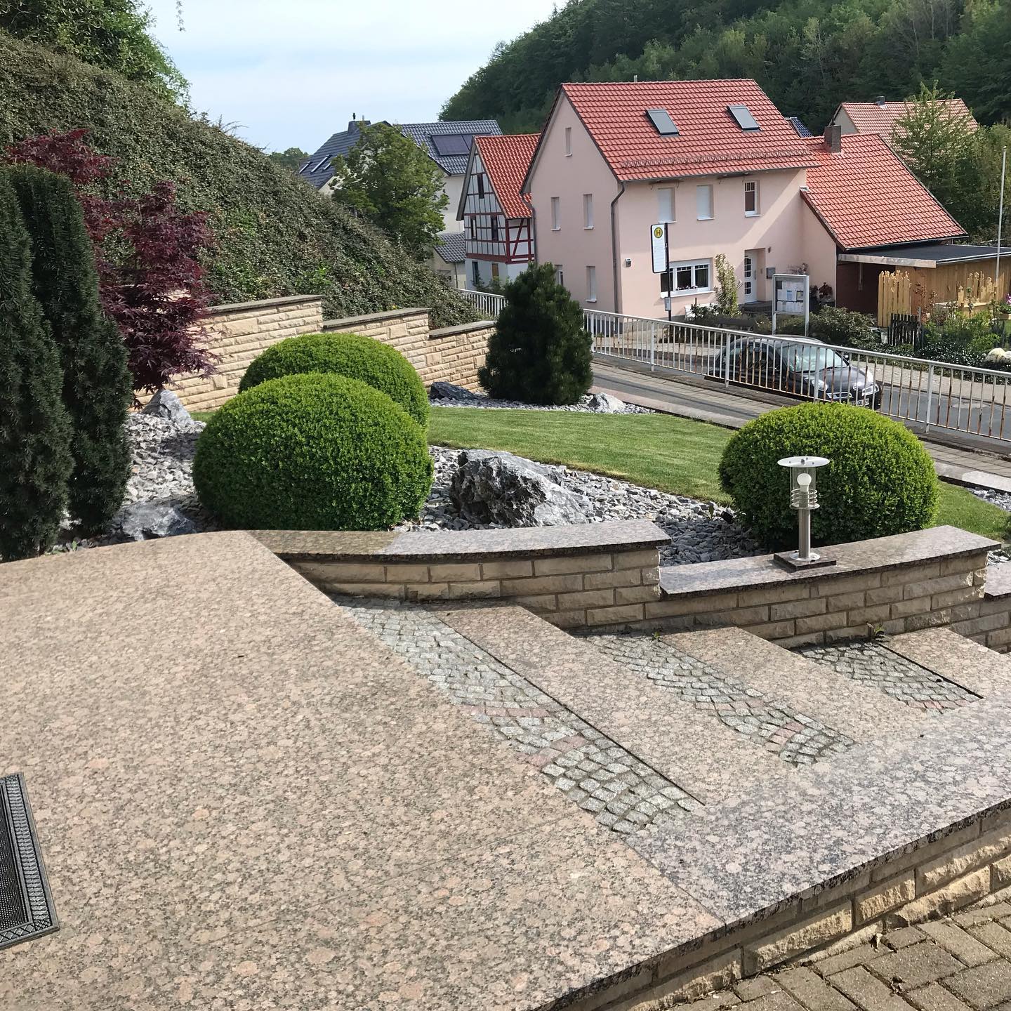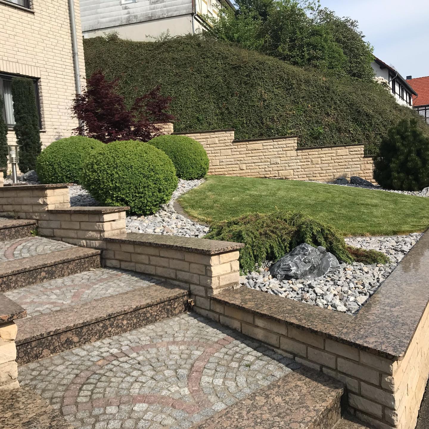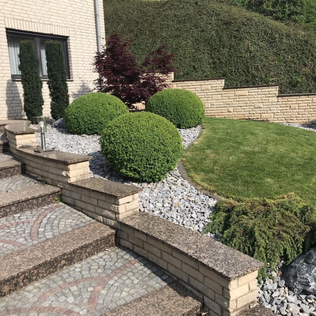 - Helle Akzente: Ausgewählter, heller Kies umspielt Treppe und Mauer. Er schafft eine ruhige Fläche, die Ihrem Vorgarten seine besondere Note verleiht.